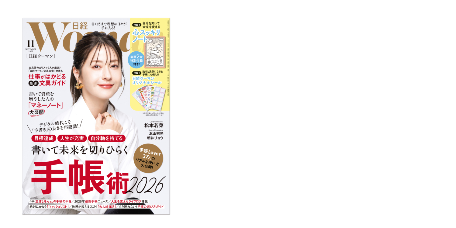 日経ウーマンは、「仕事を楽しむ 暮らしを楽しむ」をテーマに、仕事にも私生活にも本当に役立つ情報を掲載する情報誌です。
