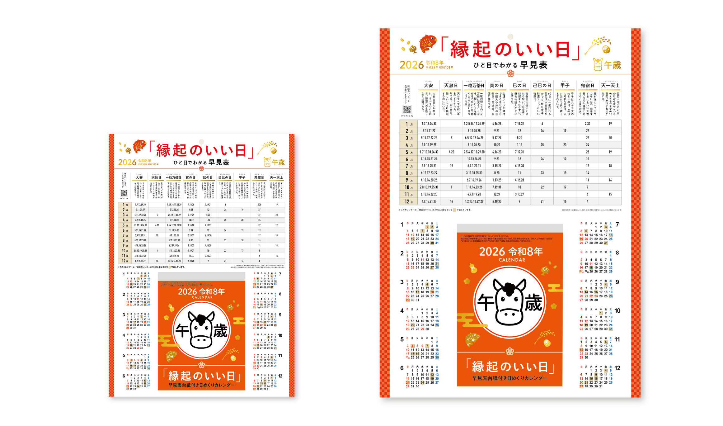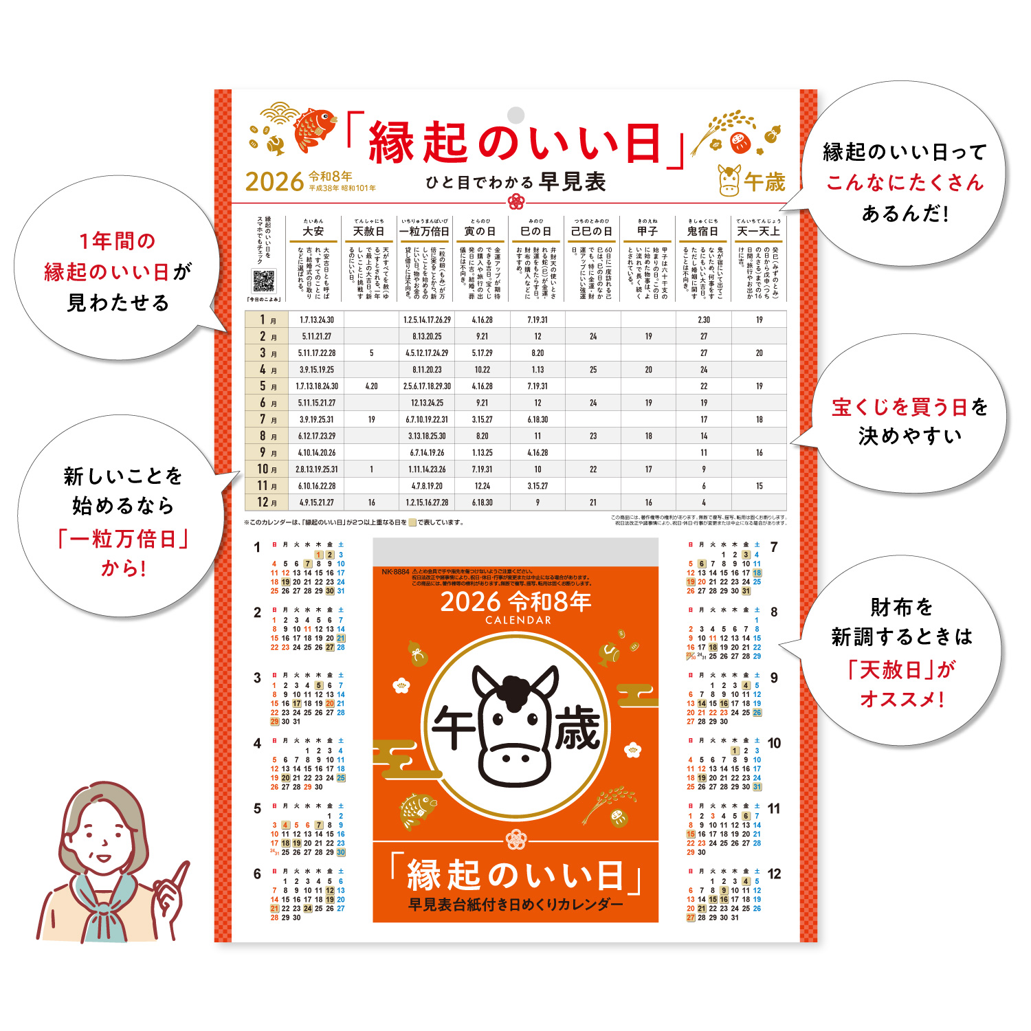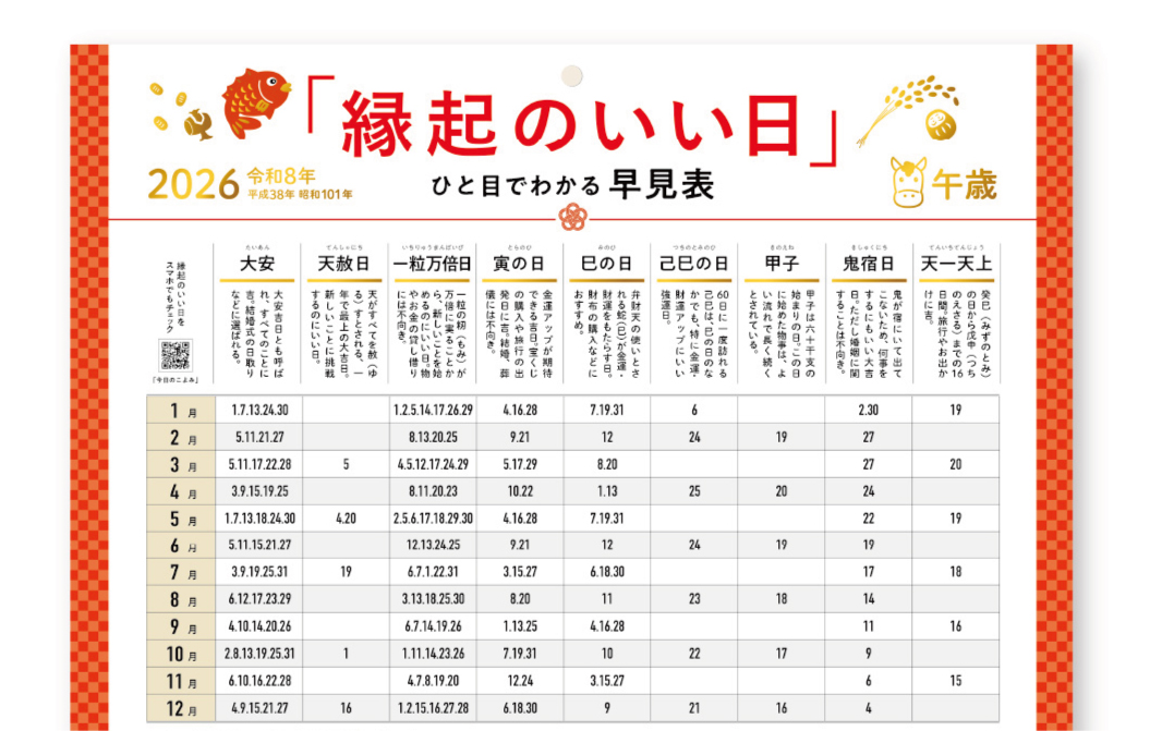 日めくりが取り付けられている台紙には、一年間の「縁起のいい日」が確認できる早見表を掲載。