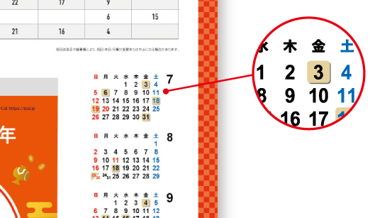 一粒万倍日・天赦日・大安など、全9種類の縁起のいい日がひと目でわかるデザインになっています。