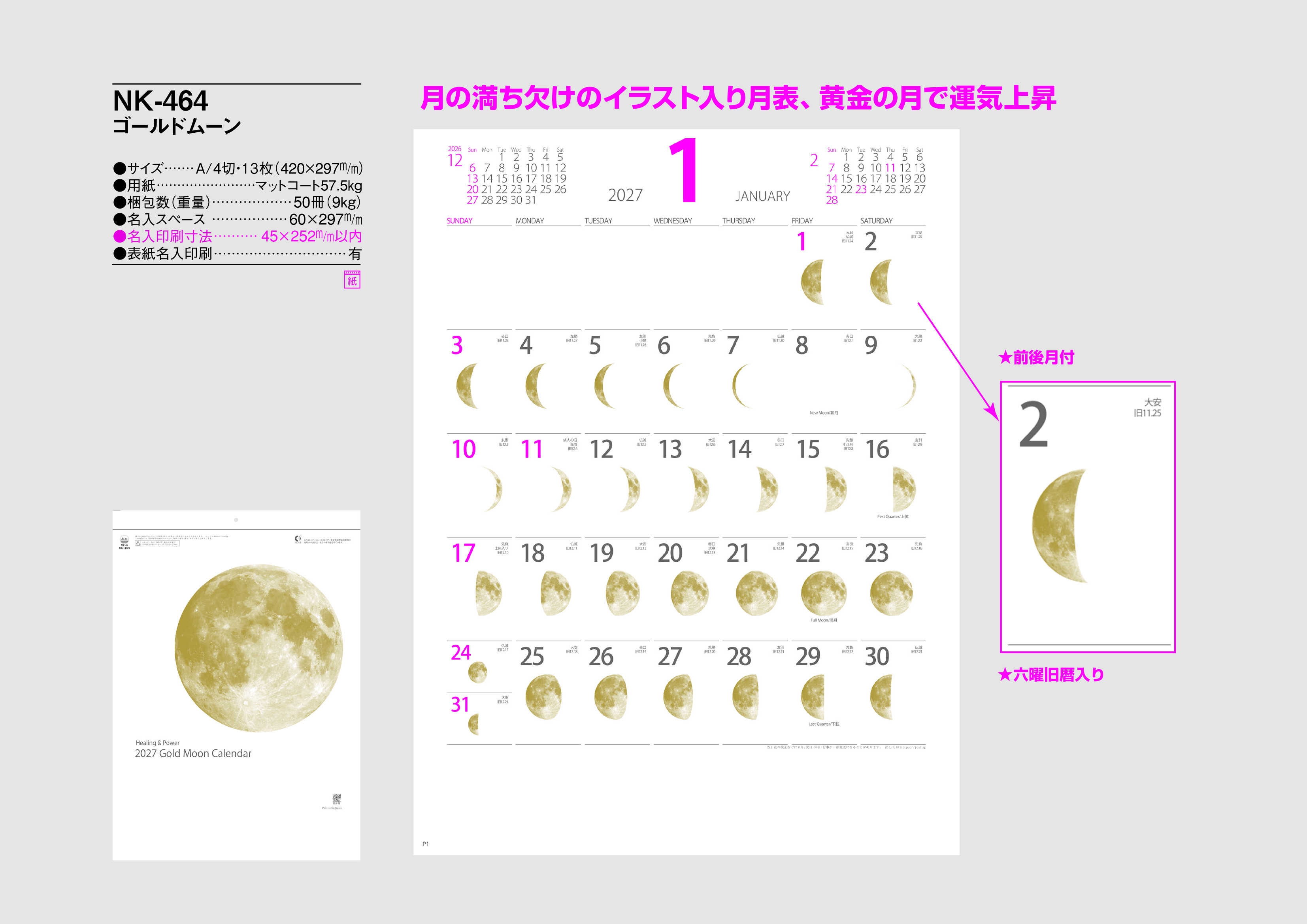 月の満ち欠けのイラスト入り月表、黄金の月で運気上昇